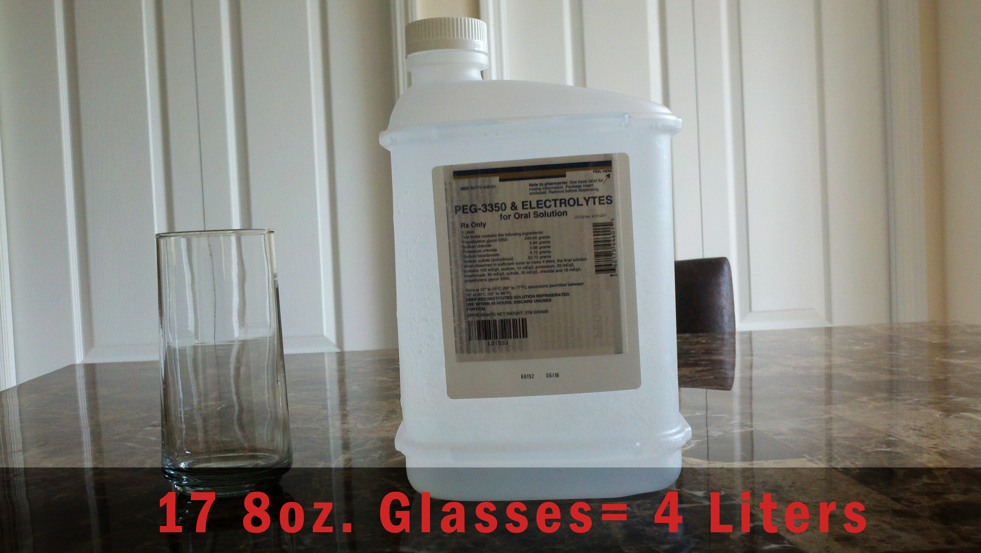 2 days prior to the procedure, I could not be on any of the ibuprofen I had been taking for most of 2012.  I planned 2 1/2 weeks to get from 2-3 ibuprofen per day down to 1-2 per day.   The day before I fasted (food) and had to drink 4 liters of this:
